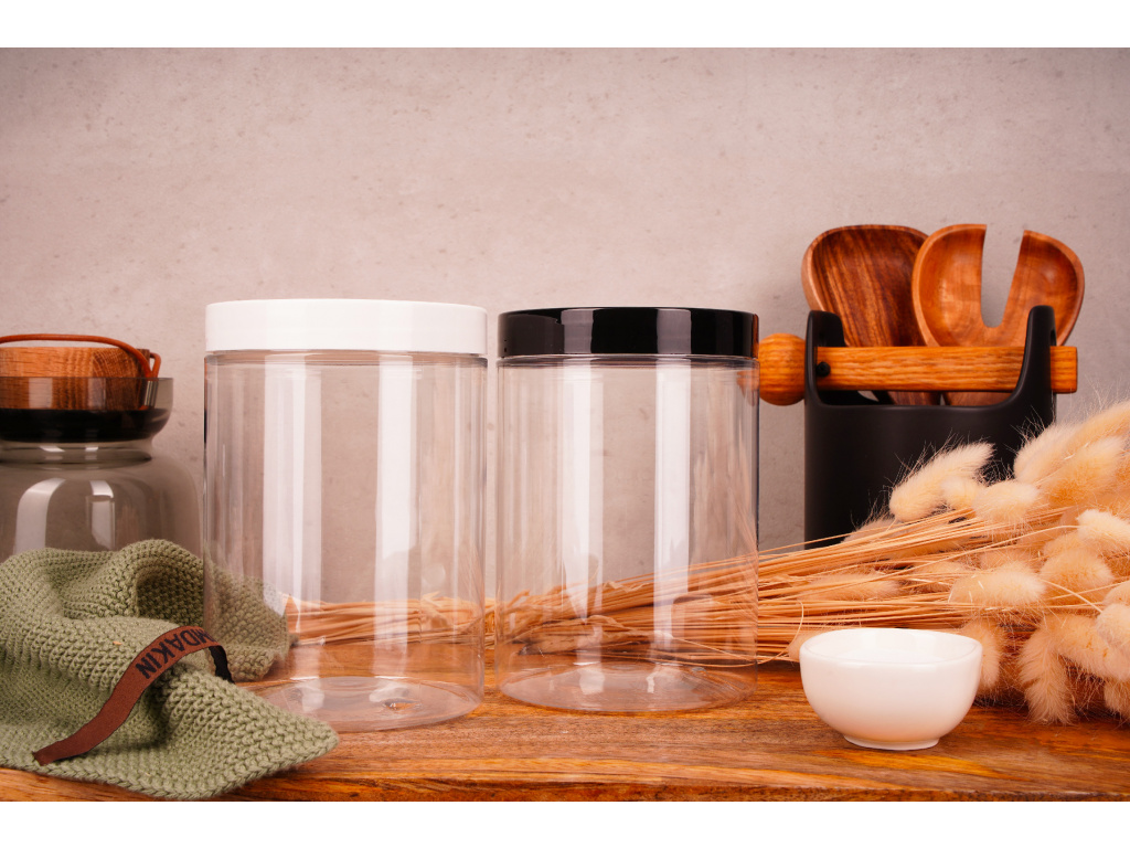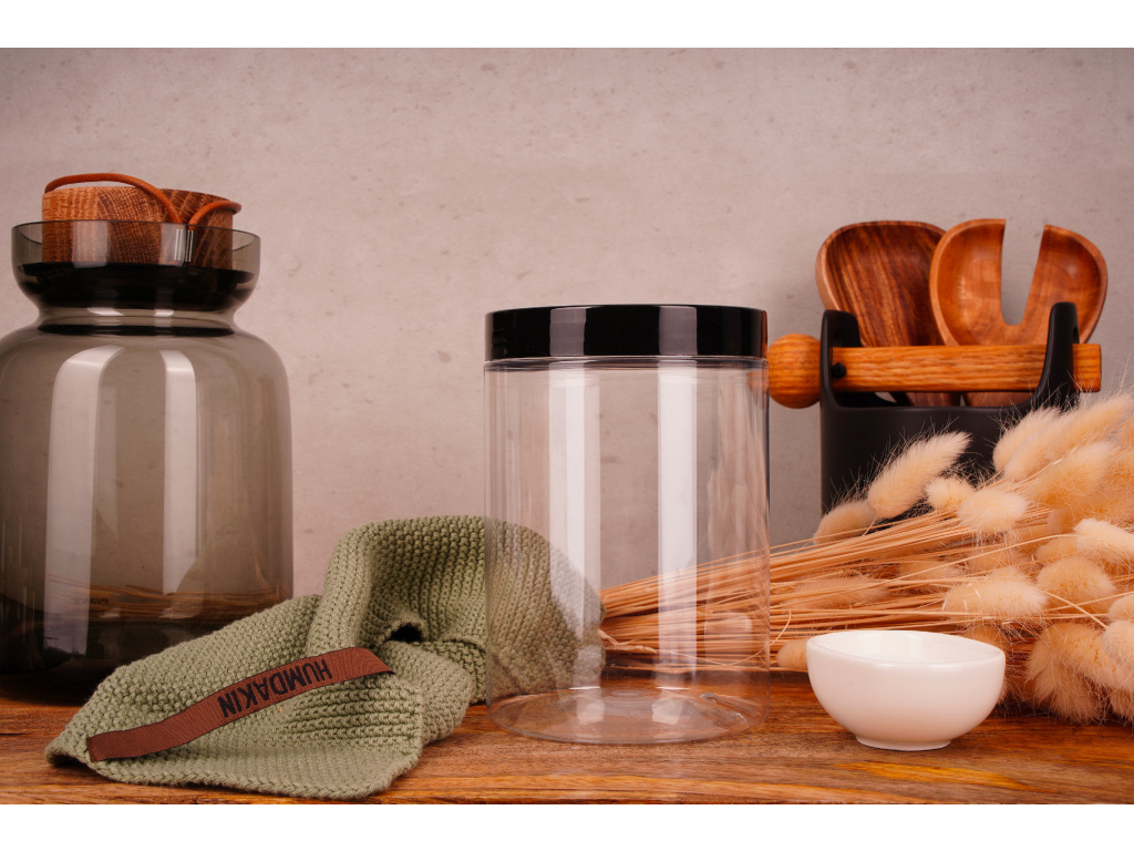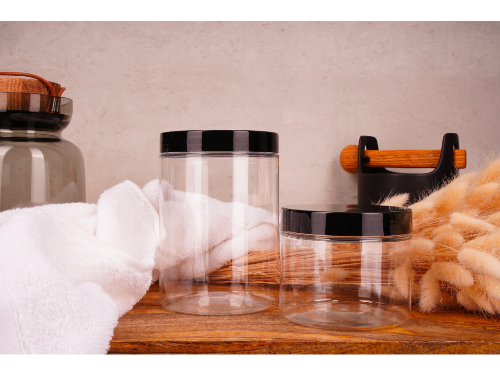 Průhledná plastová dóza s černým šroubovacím víčkem 1l
